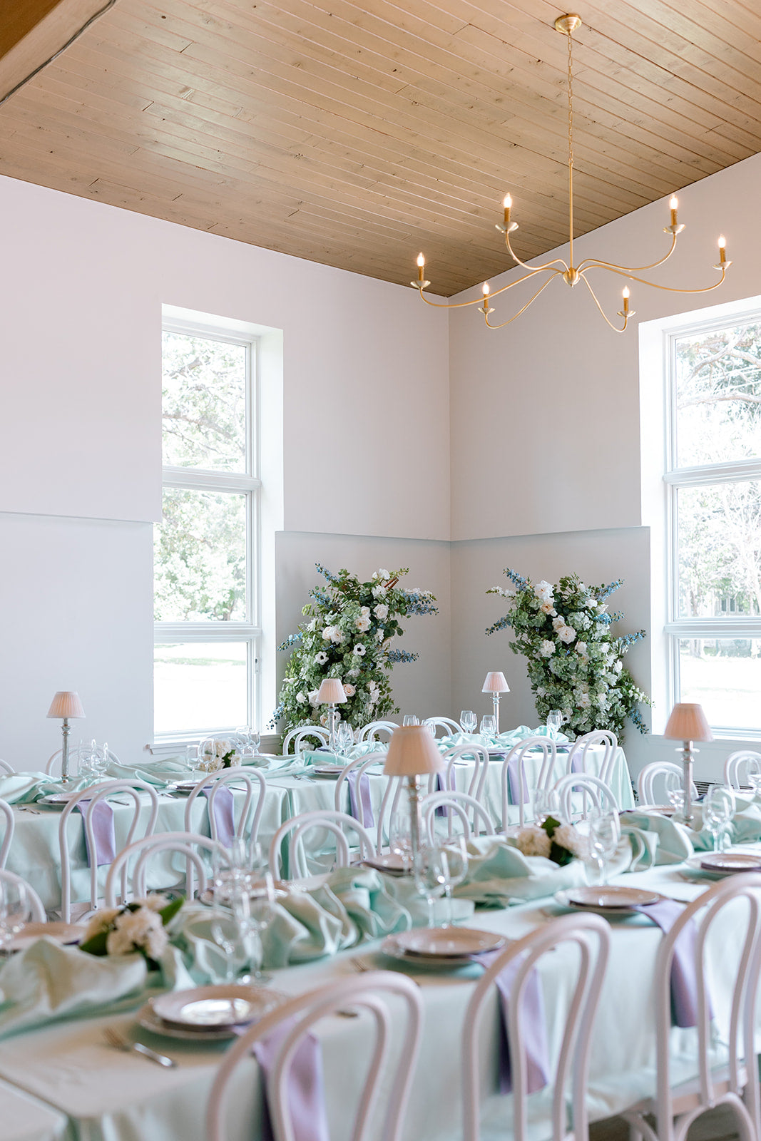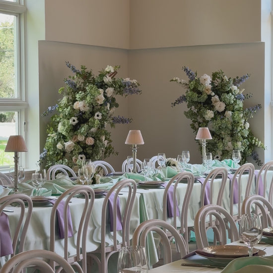 The Louise Pillars were designed with a French Provencal theme creating a timeless look, using ivory garden roses, playa blanca roses, ivory delphinium, light blue delphinium, white anemone, white ranunculus, white snapdragons, ivory rosebuds, ivory hydrangeas, seeded eucalyptus, and sage green spiral eucalyptus.